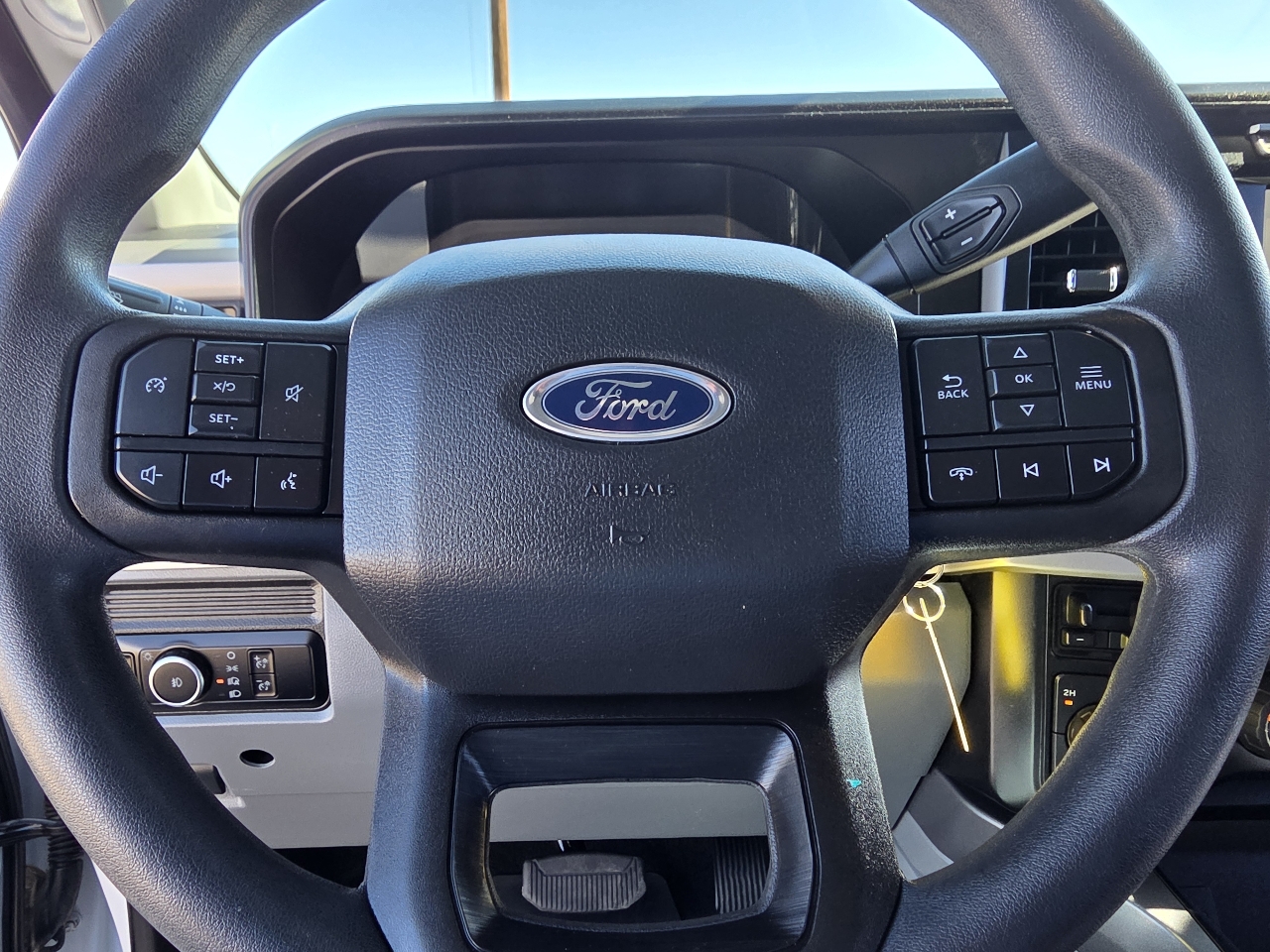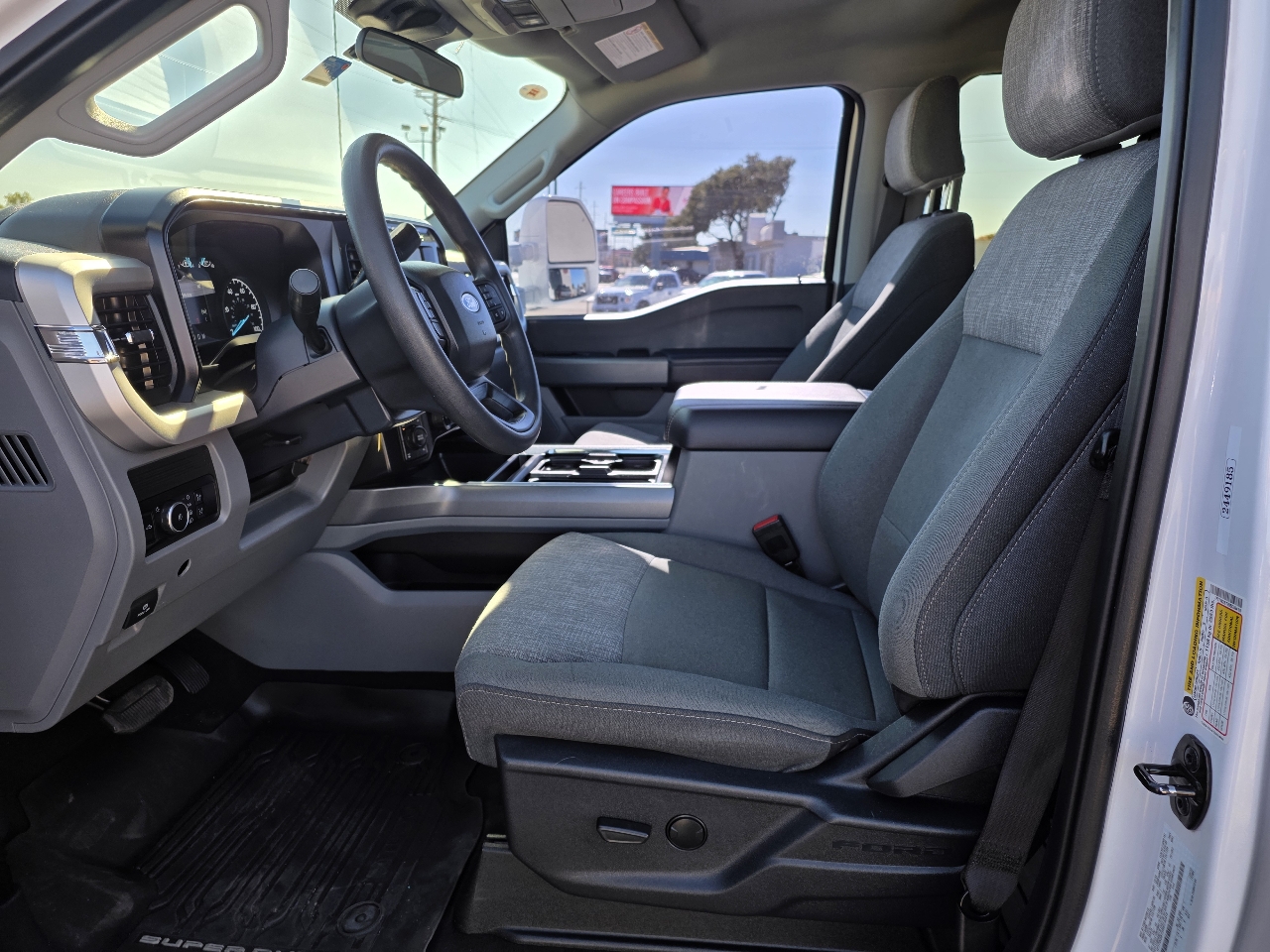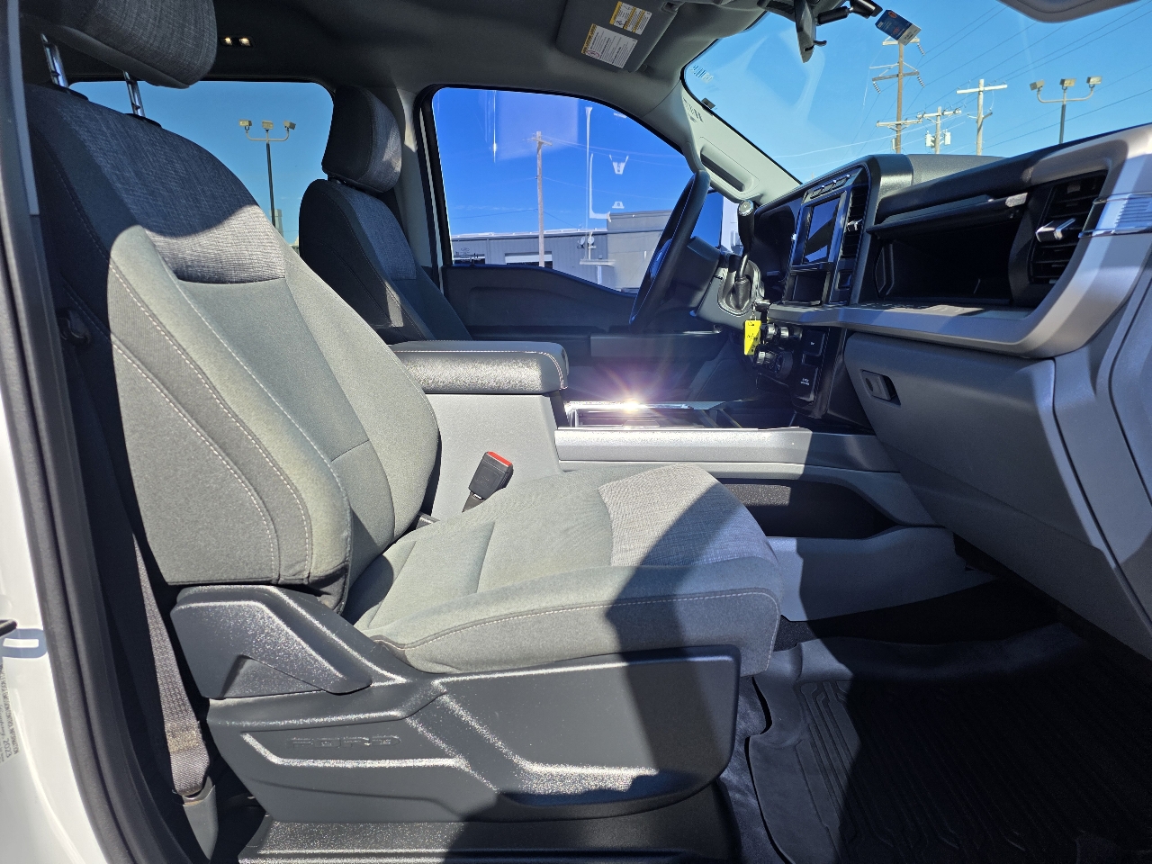 The sleek exterior features black side windows trim and boxside steps, giving this truck a tough and stylish look. Whether you're hauling cargo or towing a trailer, the trailer wiring harness and steel spare wheel have got you covered. Inside, you'll find a comfortable cabin with FordPass Connect 5G Mobile Hotspot internet access and a driver information center to keep you connected on the go. Safety features like the Safety Canopy System and rear child safety locks provide peace of mind for you and your passengers.